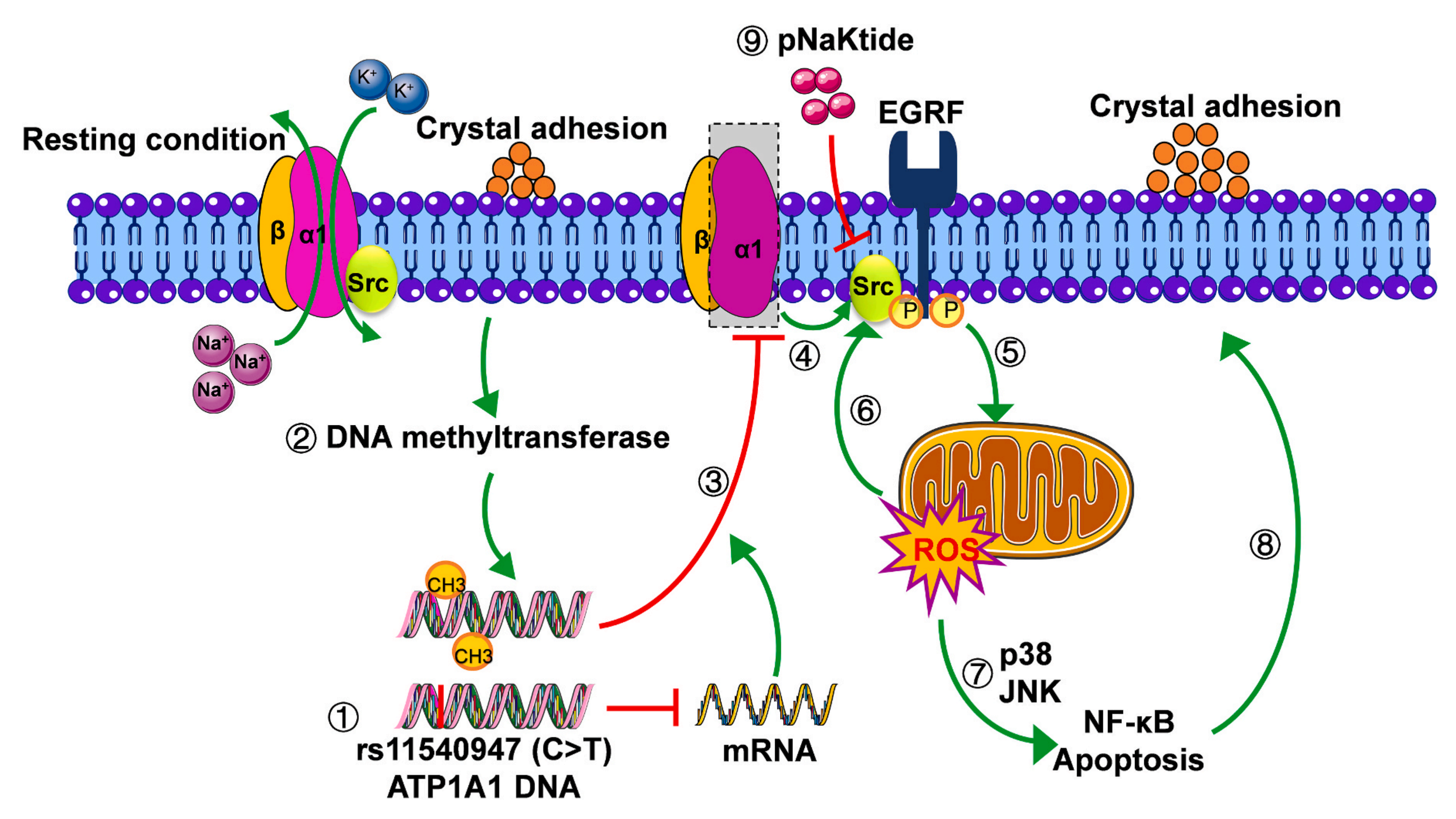 接下來,該研究從WES數(shù)據(jù)中提取了ATP1A1的SNP,rs11540947 T等位基因在患者組中的突變頻率頻率為16.1%,而對照組僅為2.4%。為進(jìn)一步證實(shí)rs11540947與鈣結(jié)石形成的相關(guān)性,收集214例鈣結(jié)石患者和232例匹配對照,通過HRM分析檢測rs11540947的基因型,結(jié)果顯示,CT+TT攜帶者在患者中比對照組更常見,且在男性中與鈣結(jié)石有關(guān),但在女性中無顯著相關(guān)性,SNPrs11540947 (NM_000701:c.-78C > T)位于?ATP1A1?的 5′UTR 中;在ATP1A1的5′UTR中發(fā)現(xiàn)了Sp1結(jié)合位點(diǎn)和潛在的TATA盒,表明5′UTR具有啟動子活性,雙熒光素酶報(bào)告基因結(jié)果也證明了這一點(diǎn),rs11540947的T等位基因介導(dǎo)了ATP1A1啟動子活性的顯著降低,這可能會降低ATP1A1在轉(zhuǎn)錄水平的表達(dá)。對草酸鈣一水合物(COM)暴露處理的HK2細(xì)胞(人腎近曲小管上皮細(xì)胞)進(jìn)行指標(biāo)測定,結(jié)果顯示處理3h后,NKA酶活性和ATP1A1 mRNA水平顯著下降,6h后ATP1A1的蛋白水平升高,隨后降低,同時(shí)COM 暴露后細(xì)胞內(nèi) ROS 水平顯著增加,這可能與ATP1A1/Src信號通路的激活有關(guān),而ATP1A1的過表達(dá)抑制了COM誘導(dǎo)的Src、p38、JNK、p65和p50激活;WB結(jié)果也顯示COM激活的半胱天冬酶3被ATP1A1的過表達(dá)以及ATP1A1/Src信號復(fù)合物的特異性拮抗劑pNaKtide顯著抑制,從而阻斷了細(xì)胞凋亡過程。