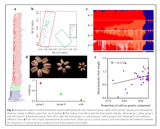 基于重測序數(shù)據(jù),研究人員推測了這些物種的有效群體大小的變化,并發(fā)現(xiàn)在 Pleistocene期間發(fā)生了瓶頸事件,且在 ~200 kyr前,有效群體大小增加。系統(tǒng)發(fā)育樹顯示馴化和野生開心果之間的分離(圖4a)。利用δaδi推算野生和馴化開心果的分化時間在 ~8000年前,這與早在公元前6750年就表明開心果種子是一種常見的食物這一考古記錄相似。為了深入了解開心果種質(zhì)之間的遺傳關(guān)系,研究人員進(jìn)行了兩項(xiàng)經(jīng)典分析:群體結(jié)構(gòu)和主成分分析(圖4b,c)。這些分析清晰的顯示栽培種質(zhì)分為兩個群。栽培種Group I的LD最高,栽培種Group II和野生開心果的LD衰減值相近。Group II包括 Qazvini,Italiaei和Badami