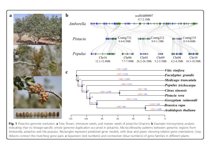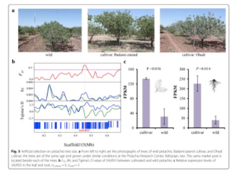 在本研究中,為了更好地了解開心果馴化的分子進(jìn)化歷史,研究人員組裝了開心果的基因組草圖,并對107個全基因組進(jìn)行了重測序,包括93個馴化和14個野生的開心果以及35個不同野生黃連木屬物種。整合基因組和轉(zhuǎn)錄組學(xué)分析顯示,擴(kuò)張的基因家族(如細(xì)胞色素P450和幾丁質(zhì)酶)和茉莉酸(JA)生物合成途徑可能參與應(yīng)激適應(yīng)。比較群體基因組分析顯示,開心果大約在8000年前被馴化,馴化的關(guān)鍵基因可能是那些涉及樹木和種子大小的基因,這些基因經(jīng)歷了人工選擇。這些基因組序列應(yīng)該有助于未來的研究,以了解沙漠作物的農(nóng)業(yè)和環(huán)境相關(guān)特性的遺傳基礎(chǔ)。