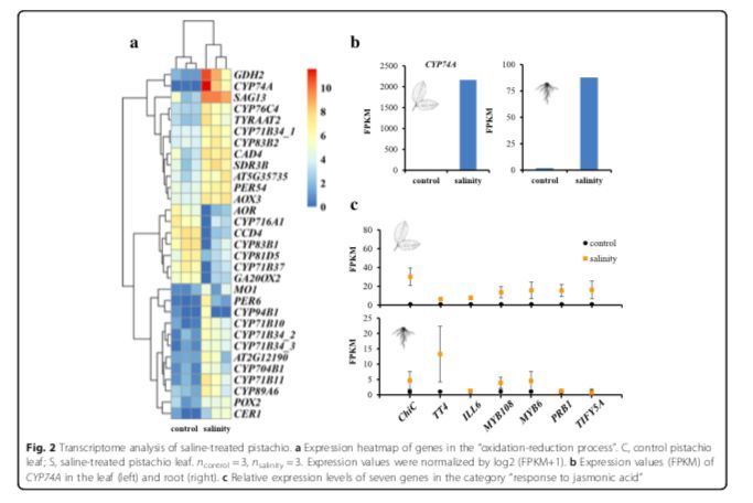 進(jìn)一步研究開心果的耐鹽性潛在遺傳機(jī)制,研究者進(jìn)行了鹽度實(shí)驗(yàn)。開心果砧木(P.vera?L.cv.Ohadi)的葉和根在正常條件和鹽度條件下進(jìn)行RNA測序。使用Tophat-Cufflinks-Cuffdiff?pipeline,在鹽水條件下處理的植物與對照之間表現(xiàn)出差異表達(dá),鑒定214和461蛋白質(zhì)編碼基因分別在葉和根組織中(ncontrol = 3, nsalinity = 3, corrected P < 0.05,)?;蚋患治霭l(fā)現(xiàn)許多差異表達(dá)基因(31個基因)參與到“氧化還原進(jìn)程”中(圖2a,b)。像比較基因組分析一樣,該類別中的15個基因是細(xì)胞色素P450基因,特別是CYP74A(即AOS),其編碼細(xì)胞色素P450 CYP74基因家族的一個成員,其起到丙二烯氧化物合酶(AOS)的作用。這種酶催化茉莉酸酯合成中的第一步[即茉莉酸(JA)]。AOS中每千堿基外顯子的表達(dá)片段(FPKM)值在葉片中從對照中的近0增加到鹽水條件下的2163.75,在根中從對照中的1.87增加到鹽水處理的87.74。研究者還發(fā)現(xiàn)了7個差異表達(dá)的基因(ChiC, TT4, ILL6, MYB108, MYB6, PRB1, and TIFY5A)被富集到“茉莉酸反應(yīng)”中。以前的研究表明,干旱和高鹽度導(dǎo)致水稻葉片和根部JA含量增加。鹽度處理可以增加濕地物種鳶尾(Iris hexagona)中的內(nèi)源JA水平。茉莉酸酯激活植物對生物脅迫(即病原體攻擊)和非生物脅迫(即鹽)的反應(yīng)。在此,用鹽水處理增加了在葉和根中參與茉莉酸反應(yīng)的這些基因的表達(dá)水平(圖2c)。這些基因的表達(dá)增加(例如,AOS作為酶催化茉莉酸酯合成中的第一步)應(yīng)該增加茉莉酮酸酯的合成,因此,它們很可能被開心果用于應(yīng)對鹽脅迫。