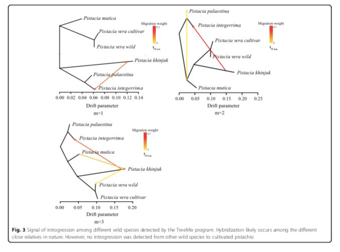 為了研究開心果的種群歷史和適應(yīng)性進(jìn)化,研究者對107個開心果基因組進(jìn)行重測序,包括93個品種和14個野生開心果,平均測序深度為6-8X。作者還重新測序了來自不同近緣種的35個基因組,包括P.mutica,P.khinjuk,P.integerrima和P. palaestina。用stringent GATK pipeline,發(fā)現(xiàn)14.77百萬個單基因變異位點(diǎn),其中2.42百萬個在基因區(qū)。使用鄰近法和最大似然法的系統(tǒng)發(fā)育分析清楚地分離了5種不同的種群,即?P.vera, P.mutica, P. khinjuk, P. integerrima, and P. palaestina。通過TreeMix程序在一些物種之間檢測到漸滲的信號,這表明雜交可能在自然界中的不同近親之間發(fā)生,并且與植物中被發(fā)現(xiàn)的普遍雜交一致。然而,從其他開心果物種到馴化的開心果沒有檢測到漸滲,這種現(xiàn)象來源于野生的P. vera(圖3)。