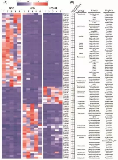 1) ?如下圖顯示,在三個分組中一共找到85個相對豐度有顯著差異的OUT。與NCD組相比,HFD組有27個相對豐度顯著增高的OTU,42個顯著降低的OTU。與HFD組相比,添加了褪黑素的組有10個相對豐度顯著增高的OTU,20個顯著降低的OTU;而在這30個差異性的OTU中,有14個OTU的變化方向與和NCD組比較的結(jié)果完全相反。這14個OTU屬于RuminococcaceaeDesulfovibrionaceae、Bacteroides、Porphyromonadaceae、HelicobacteraceaeChristensenellaceae,有研究表明這些微生物與肥胖相關(guān)