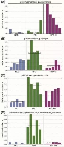 2) LEfSe分析,發(fā)現(xiàn)褪黑素顯著提高Akkermansia的相對豐度,Akkermansia即是降低高脂肪膳食小鼠體重的有益菌。而褪黑素顯著降低Alistipes、Anaerotruncus、Helicobacter?marmotae的相對豐度,則這三種細菌預(yù)防肥胖的有害菌。總之,褪黑素能夠使高脂肪膳食小鼠的腸道菌群由失調(diào)狀態(tài)轉(zhuǎn)為正常狀態(tài),從而抑制體重的增加