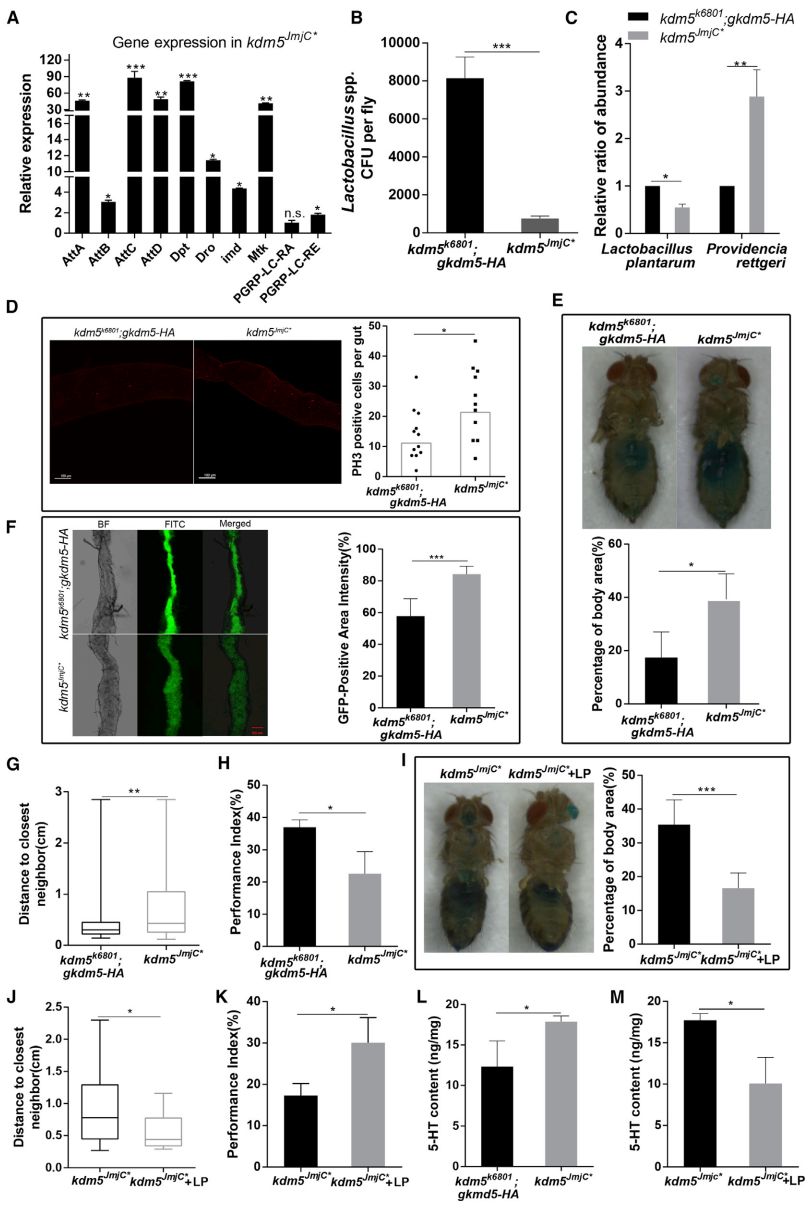越來越多的研究表明,腸道菌群可以影響智力障礙(ID)和自閉癥譜系障礙(ASD)的疾病癥狀,盡管宿主的基因能夠影響腸道菌群,然而調(diào)控宿主共生菌群穩(wěn)態(tài)的分子機(jī)制在正常和疾病狀態(tài)下仍然未知。KDM5蛋白家族是一種轉(zhuǎn)錄調(diào)控因子,它通過組蛋白H3K4me3去甲基化修飾來發(fā)揮作用,然而在ID和ASD患者中,KDM5A/KDM5B/KDM5C發(fā)生了功能喪失型基因突變。果蠅的腸道菌群結(jié)構(gòu)簡單,遺傳和生理易于操控,可以為宿主-微生物的互作研究提供良好的體系,此外攜帶與人類KDM5C(kdm5A512P)致病錯義突變類似等位基因的果蠅表現(xiàn)出學(xué)習(xí)和記憶缺陷。與腸內(nèi)共生菌接觸的腸上皮細(xì)胞能夠細(xì)菌信號產(chǎn)生活性氧,劉老師課題組的前期研究發(fā)現(xiàn),KDM5能夠調(diào)節(jié)果蠅的細(xì)胞氧化應(yīng)激,因此本研究旨在探究KDM5通過調(diào)節(jié)腸道菌群來影響果蠅社交行為的機(jī)制。