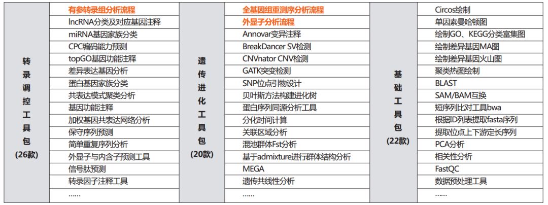 2)軟件:根據(jù)用戶需求我們提供了常用生信軟件,并封裝和串聯(lián)成常用分析模塊,通過單行命令即可完成很多常規(guī)分析內(nèi)容,如基因表達(dá)量計(jì)算、突變檢測、基因功能注釋等。