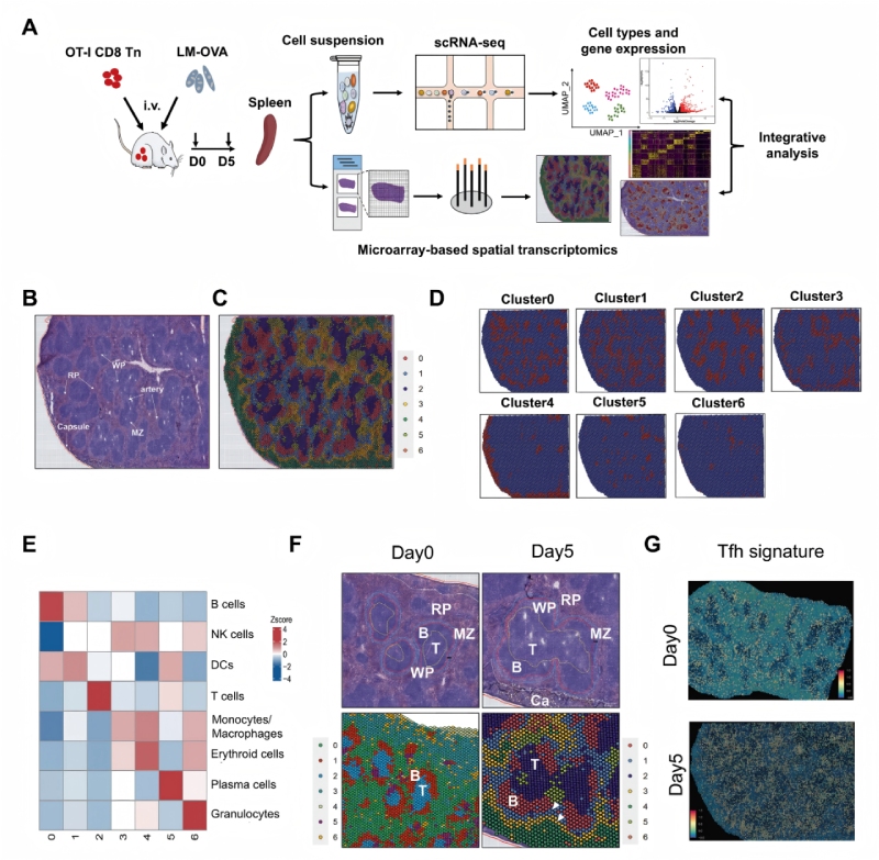 為了研究免疫反應(yīng)過程中不同免疫細(xì)胞的空間分布和CD8+?T細(xì)胞分化的調(diào)節(jié)機(jī)制,研究人員通過整合單細(xì)胞RNA測序(scRNA-seq)和BMKMANU?S1000空間轉(zhuǎn)錄組(ST)技術(shù),分析了急性感染模型中脾臟免疫細(xì)胞的空間分布與CD8??T細(xì)胞分化機(jī)制。實(shí)驗(yàn)采用OT-I轉(zhuǎn)基因小鼠模型,通過李斯特菌(LM-OVA)感染誘導(dǎo)免疫反應(yīng),關(guān)鍵發(fā)現(xiàn)包括:1)脾臟形成7個(gè)功能集群(B細(xì)胞、T細(xì)胞、單核/巨噬細(xì)胞等);2)感染后T/B細(xì)胞區(qū)擴(kuò)大,APCs(B細(xì)胞、DC、巨噬細(xì)胞)在T細(xì)胞區(qū)外圍聚集;3)空間重組與T細(xì)胞分化(MP/TE亞群)顯著相關(guān)。多組學(xué)整合揭示了免疫微環(huán)境的動(dòng)態(tài)調(diào)控機(jī)制,為理解感染中細(xì)胞互作提供了多組學(xué)視角。
