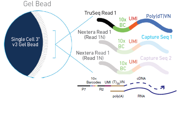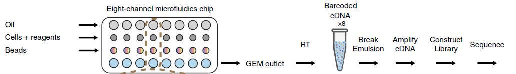 10 X Genomics單細(xì)胞轉(zhuǎn)錄組測(cè)序平臺(tái)利用微流控、油滴包裹和baecode標(biāo)記等技術(shù)來(lái)實(shí)現(xiàn)高通量的細(xì)胞捕獲技術(shù),能夠一次性分離、并標(biāo)記500–10000個(gè)單細(xì)胞,從而獲得每個(gè)細(xì)胞的3’端的轉(zhuǎn)錄組信息。具有細(xì)胞通量高、建庫(kù)成本低、捕獲周期短等優(yōu)勢(shì)。該技術(shù)主要用于細(xì)胞分型和標(biāo)記因子的鑒定,從而實(shí)現(xiàn)對(duì)細(xì)胞群體的劃分與細(xì)胞群體間基因表達(dá)差異的檢測(cè),此外該技術(shù)還可以預(yù)測(cè)細(xì)胞分化與研究發(fā)育軌跡,在當(dāng)下疾病、免疫、腫瘤領(lǐng)域以及組織、器官、發(fā)育研究中發(fā)揮越來(lái)越重要的作用。