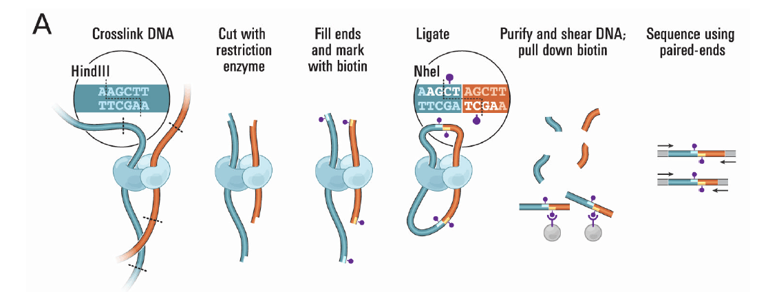 Hi-C技術(shù)是染色質(zhì)構(gòu)象捕獲技術(shù)( Chromosome conformation capture )與高通量測(cè)序( High-throughput sequencing )結(jié)合衍生的一種技術(shù)。主要是利用全基因組范圍內(nèi)整個(gè)染色質(zhì)DNA在空間位置上的關(guān)系,對(duì)染色質(zhì)內(nèi)全部DNA相互作用模式進(jìn)行捕獲,結(jié)合生物信息學(xué)方法,來獲得染色體水平的基因組序列并得到染色質(zhì)三維結(jié)構(gòu)信息。此外還可以并與Chip-seq、轉(zhuǎn)錄組數(shù)據(jù)聯(lián)合分析,從基因調(diào)控網(wǎng)絡(luò)和表觀遺傳網(wǎng)絡(luò)來闡述生物體性狀形成的相關(guān)機(jī)制。