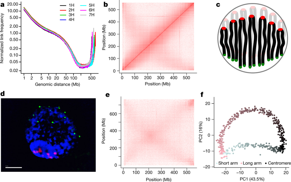 通過HIC熱圖作者發(fā)現(xiàn)無論是染色體內(nèi)部還是染色體間的長短臂之間都存在較強(qiáng)的交互信號(hào)。按照HIC的原理來說,染色體上空間作用越強(qiáng)則實(shí)際DNA間的物理距離越近,染色體大小臂及不同染色體間的相互作用應(yīng)該是極弱的。為了找出原因,作者通過對(duì)大麥葉核間期的細(xì)胞進(jìn)行著絲粒及端粒熒光雜交,發(fā)現(xiàn)所有染色體的端粒和著絲粒在空間上的位置都純?cè)跇O性,且排列方式也極其相似,不同染色體間的大小臂其實(shí)在空間上距離很近,因此確實(shí)存在染色體內(nèi)外大小臂之間大量的交互作用的可能。