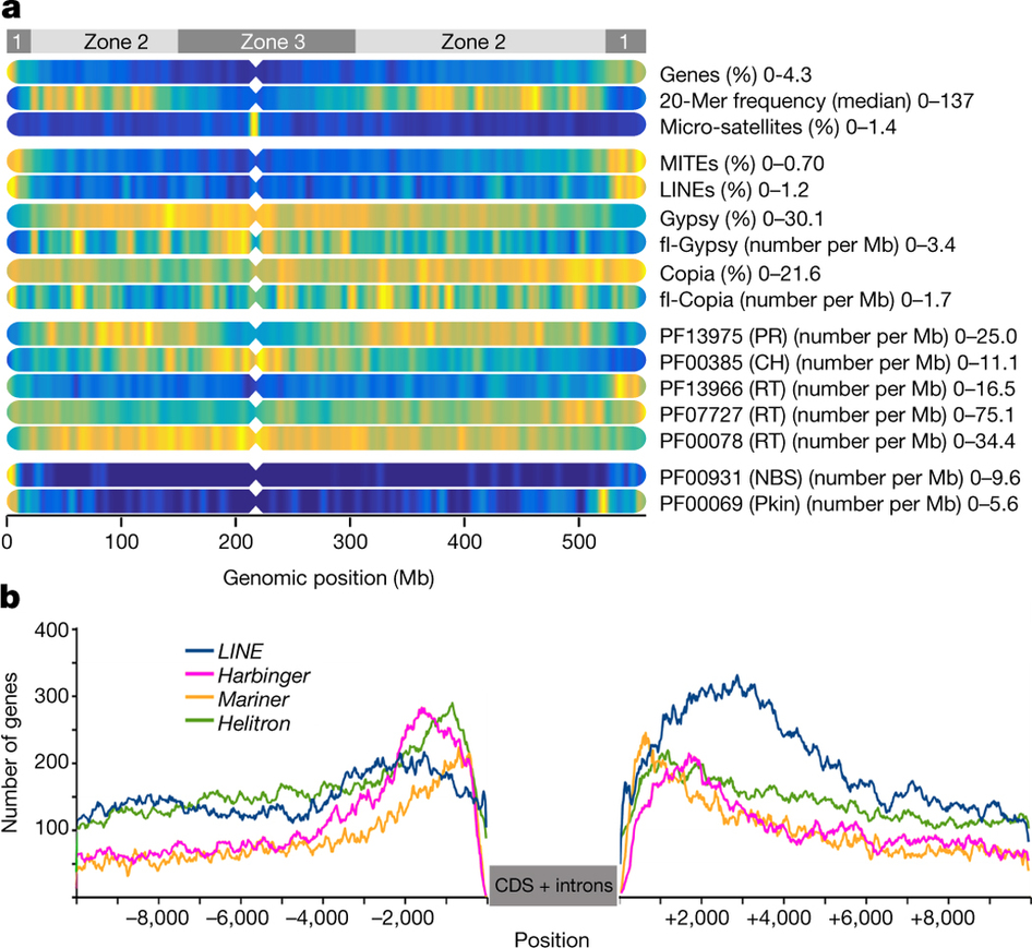 利用染色體位置信息,通過對(duì)20-mer頻率將染色體進(jìn)行劃分成了三種區(qū)域,每種區(qū)域上在基因密度,重組率,LTR插入時(shí)間以及GC含量上都存在一定的規(guī)律。