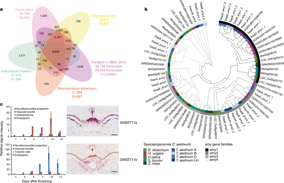 通過對(duì)大麥基因組進(jìn)行基因家族收縮擴(kuò)張分析發(fā)現(xiàn),收縮擴(kuò)張的家族中*顯著的部分都與植物防御及抗病相關(guān)。另外,作者對(duì)麥芽品質(zhì)相關(guān)的amy家族及糖代謝相關(guān)的SWEET家族進(jìn)行了亞家族分類,多倍化及表達(dá)模式相關(guān)的分析。