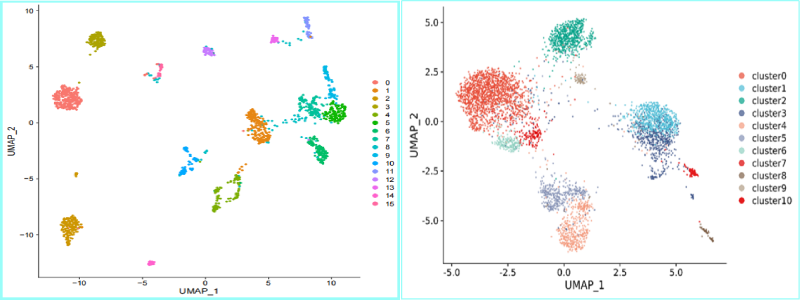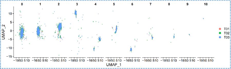 將相同的PBMC細(xì)胞懸液分3份,通過3個不同實(shí)驗(yàn)人員,用3臺百創(chuàng)DG1000儀器,獨(dú)立進(jìn)行單細(xì)胞測序,得到了幾乎一致的細(xì)胞聚類分群結(jié)果,證明百創(chuàng)DG1000具有很好的可重復(fù)性及穩(wěn)定性。