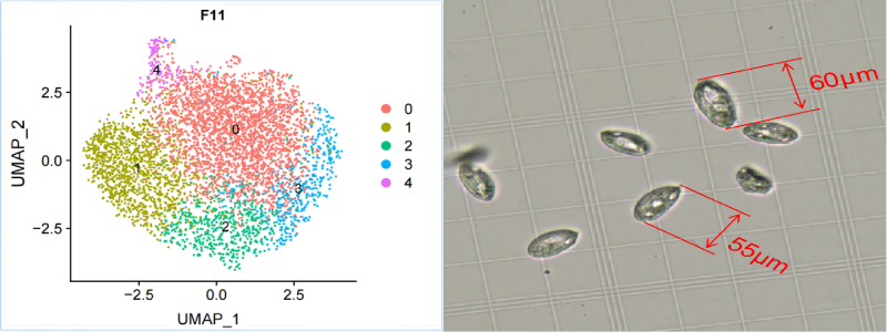 細(xì)胞直徑在55-60μm的原生動物,分別進(jìn)行了DG1000與主流平臺的測試,主流平臺未能成功捕獲,DG1000不但捕獲成功同時得到了客戶比較認(rèn)可的數(shù)據(jù),DG1000細(xì)胞直徑成功兼容到60μm,為單細(xì)胞測序獲得更多細(xì)胞類型提供可能。